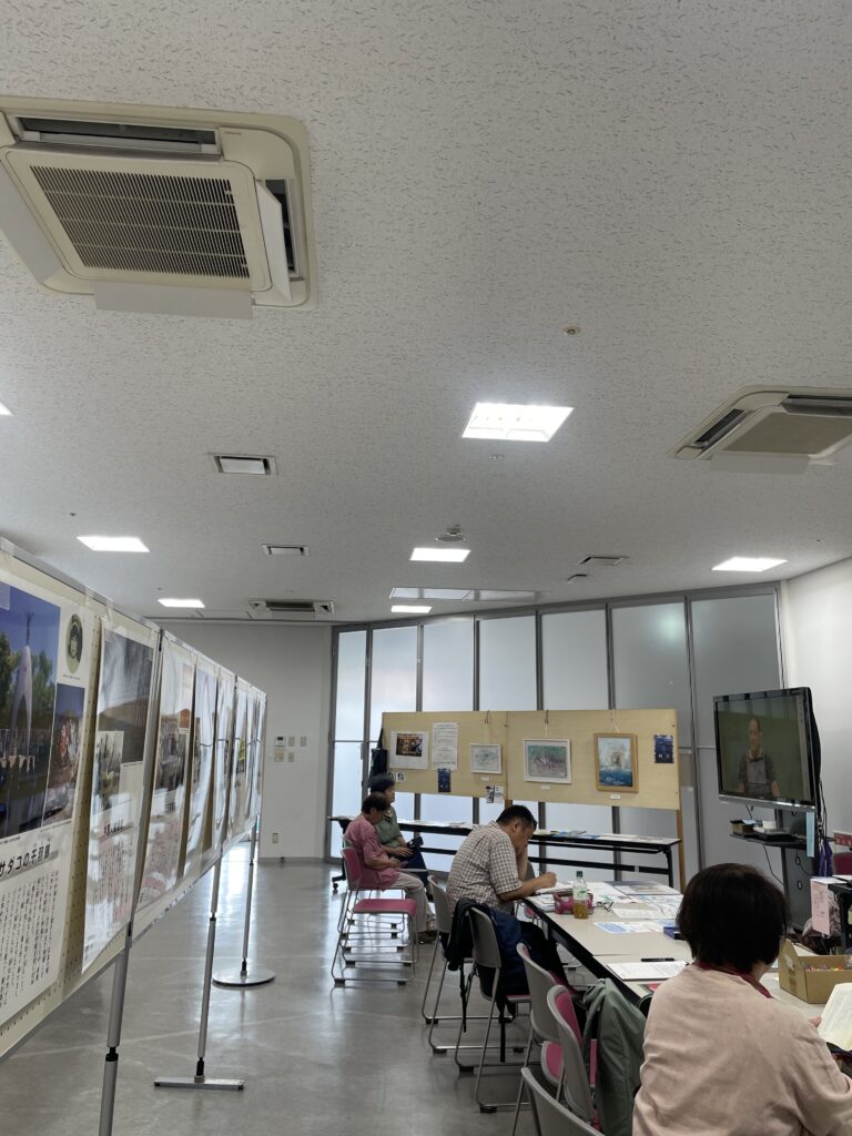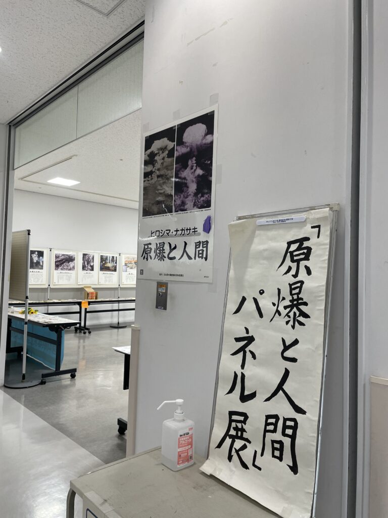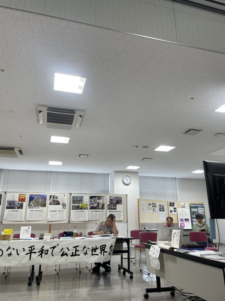 甲州市『原爆と人間パネル展』会場にて、広島での原水爆禁止世界大会2025の様子観てます。