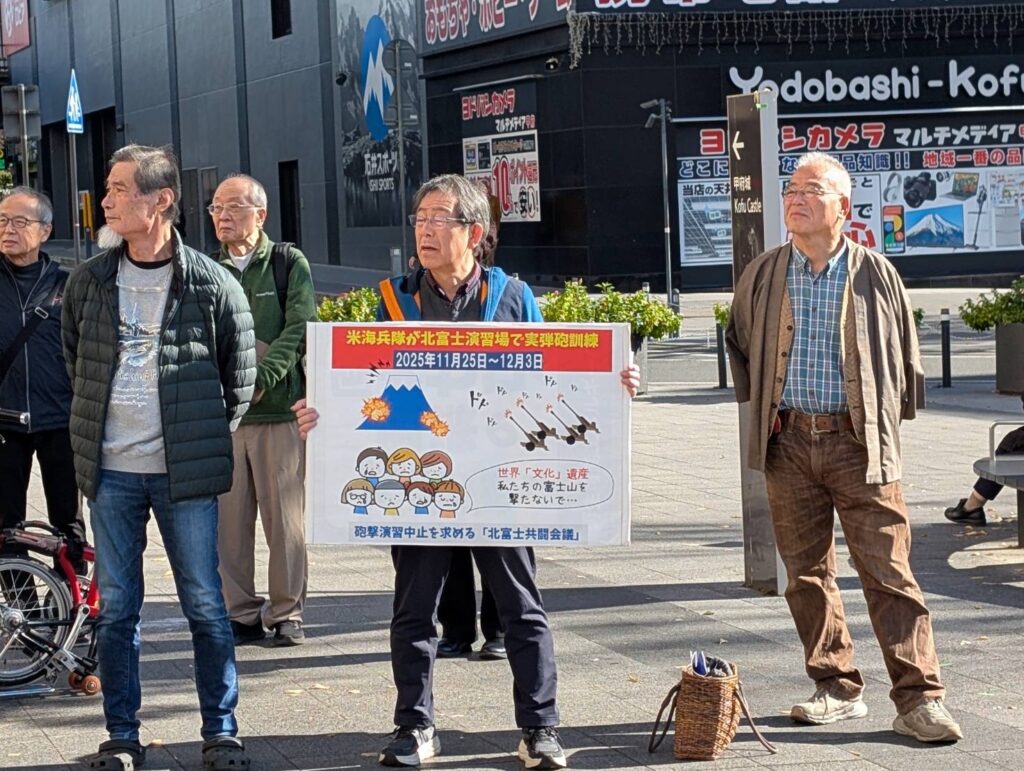 北富士演習場砲弾訓練反対行動 11.20 投稿日: 2025年11月21日2026年1月5日 投稿者: yamanashi 甲府駅南口で、北富士共闘会議の30余名がスタンディング、リレートーク、チラシ配布を30分間行いました。